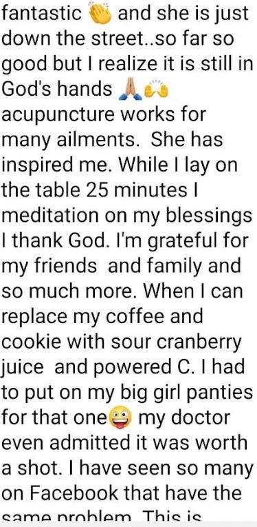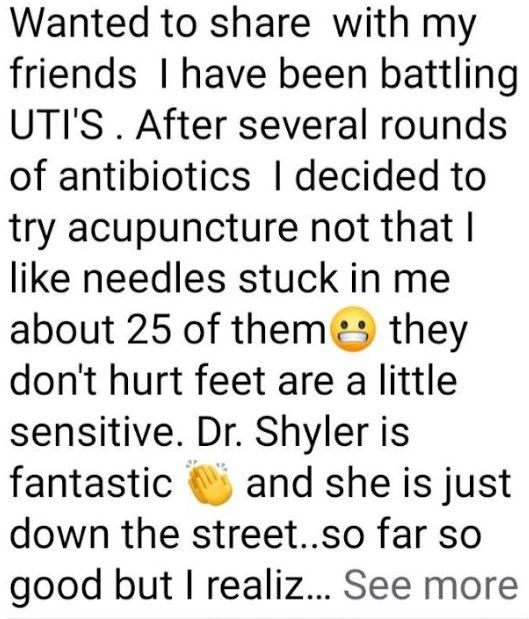 2. After a couple Acupuncture treatments, I was coming to appointments in pain, and leaving feeling much relief. She impressed me with her knowledge and compassion. I look forward to my Acupuncture treatments because she is gentle, and I leave feeling relaxed with a dramatic reduction in pain. I was also surprised at how my mental health improved. Thanks to Dr. Shyler, and consistent treatments, my nervous system calmed down, and I am completely free of pain medications. It has been a long sought blessing to live happily in my body. I am forever grateful for the difference Acupuncture has made in my quality of life. Ms. Patty